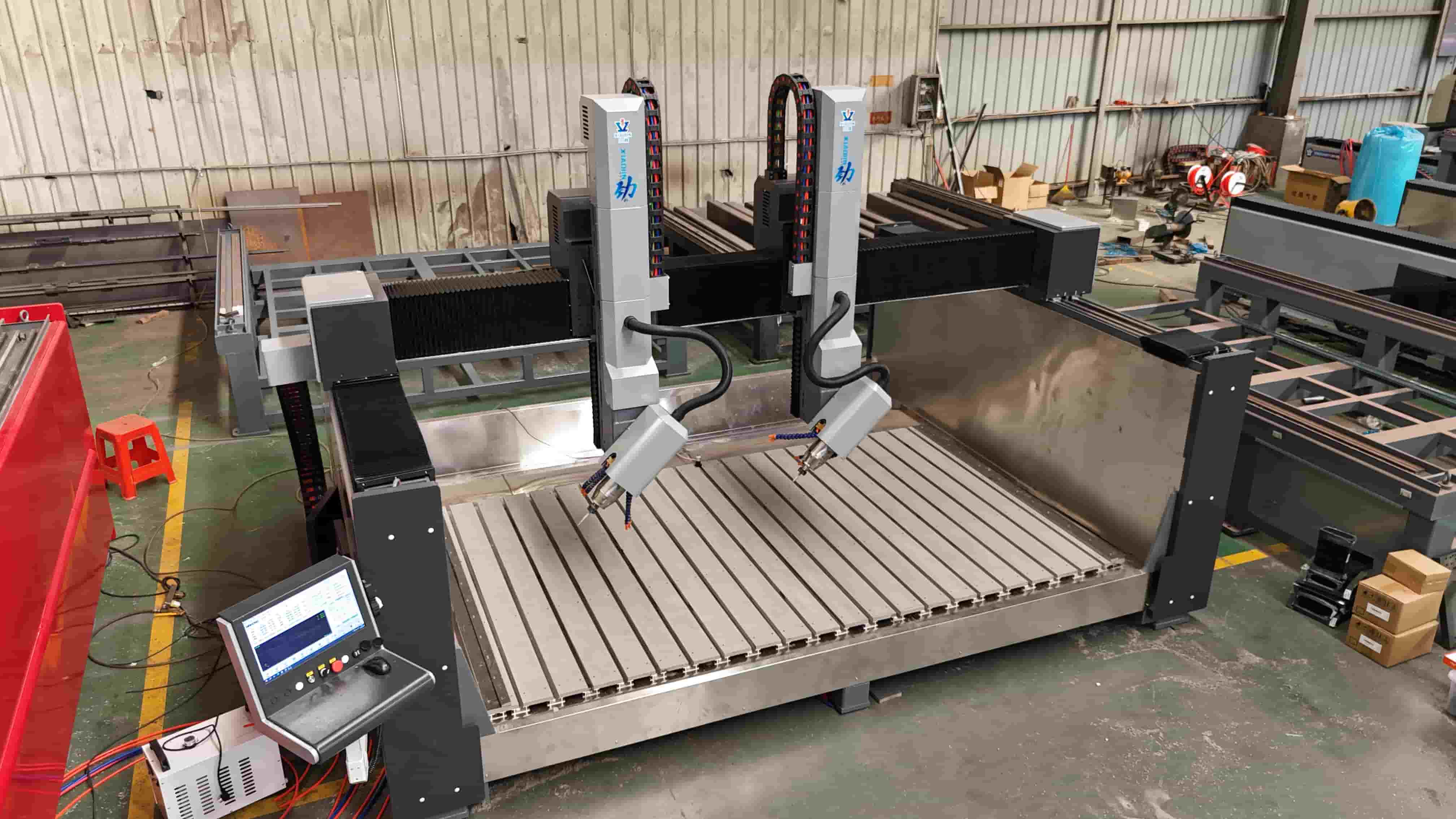 Unlike standard 3-axis CNCs (X, Y, Z), this machine adds a fourth rotational axis (A-axis). Combined with the dual heads, it offers: