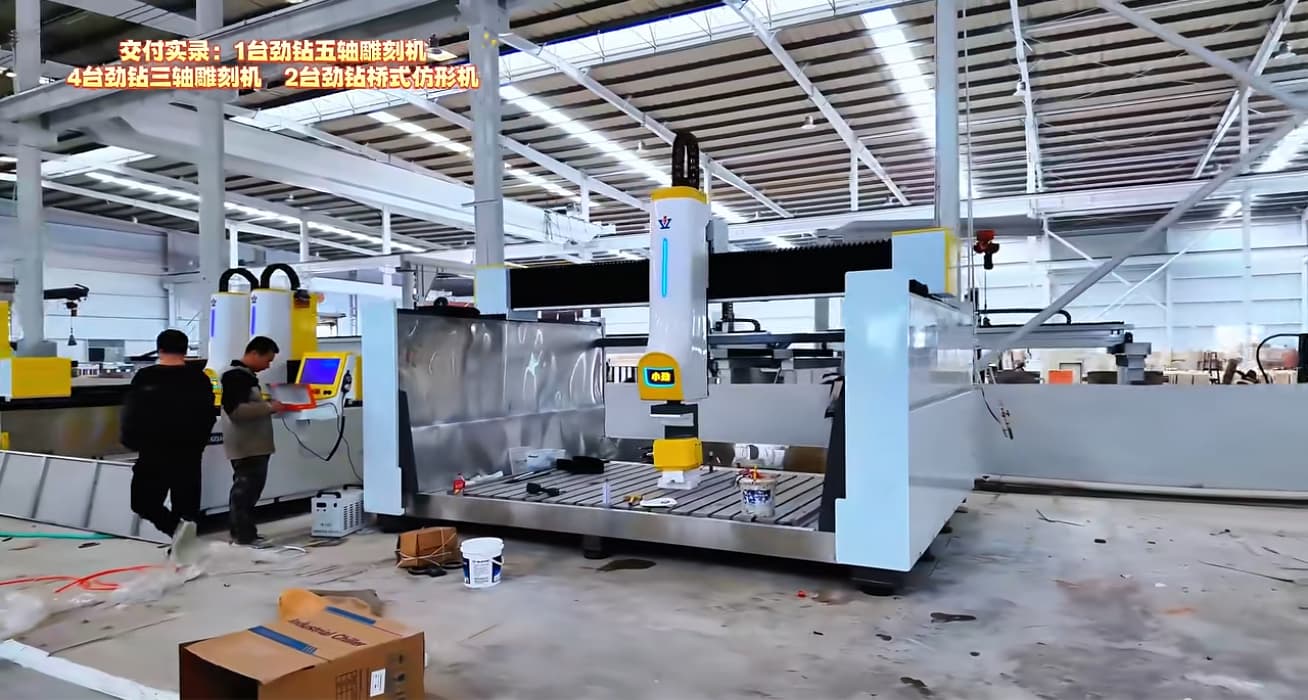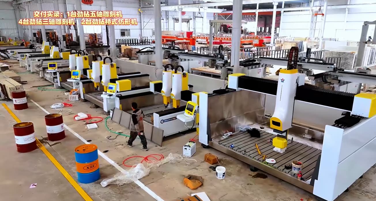 The delivery included one 5-axis CNC stone engraving machine, four 3-axis CNC engraving machines, and two bridge-type profiling machines, all installed to support high-efficiency stone fabrication.