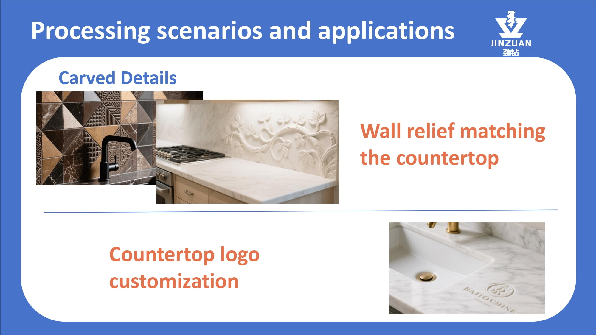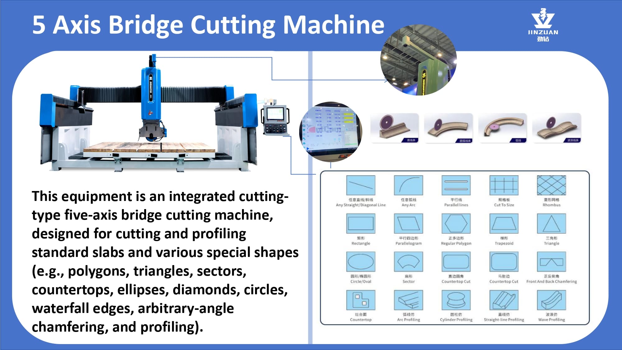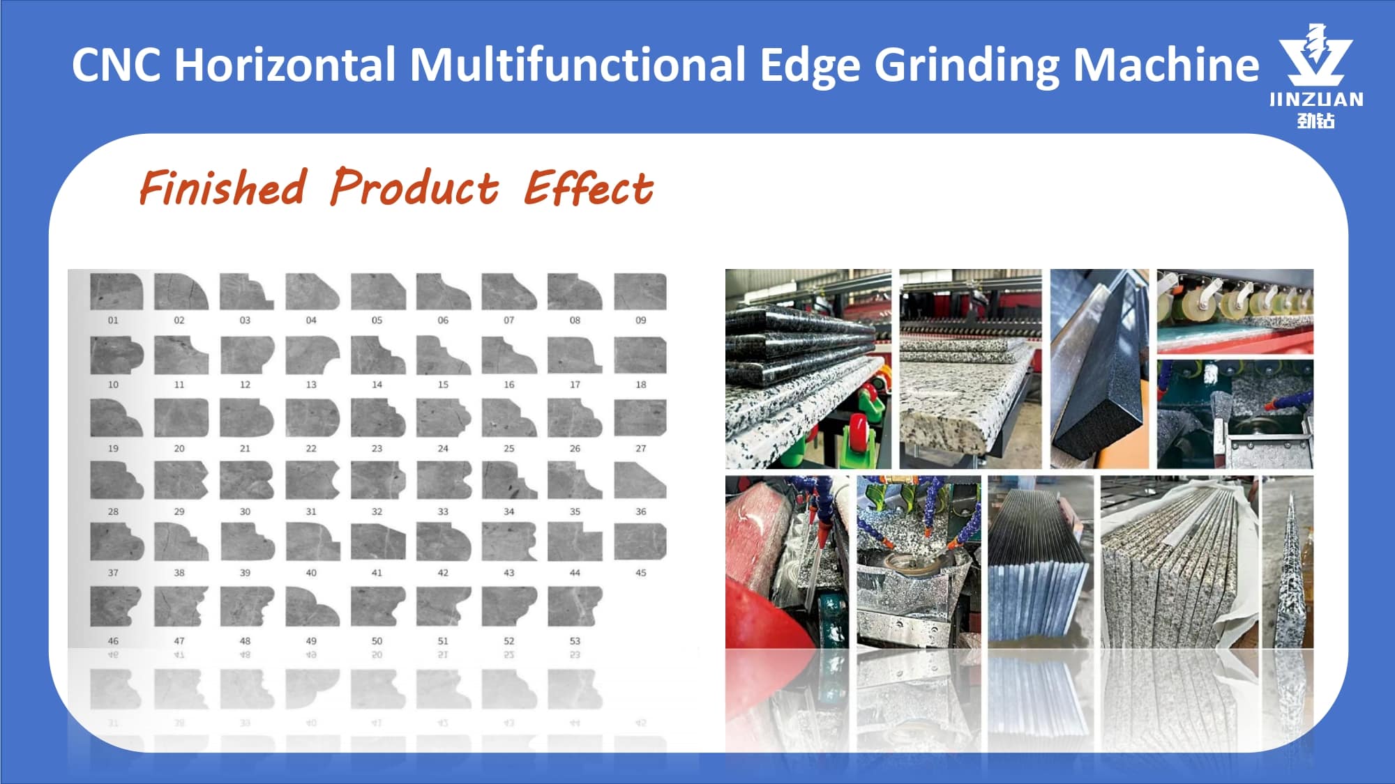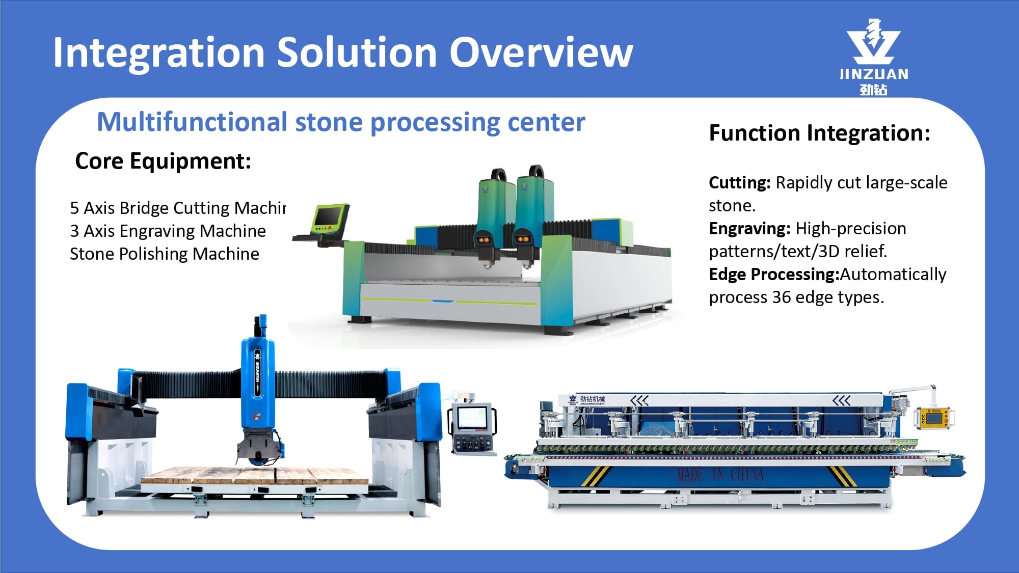 Quanzhou Jingzuan Technology Co.,LTD provides a technology-driven fabrication solution that empowers workshops to achieve unmatched precision, elevate finish quality, and significantly boost their production capacity for materials like granite, quartz, marble, and acrylic solid surfaces.