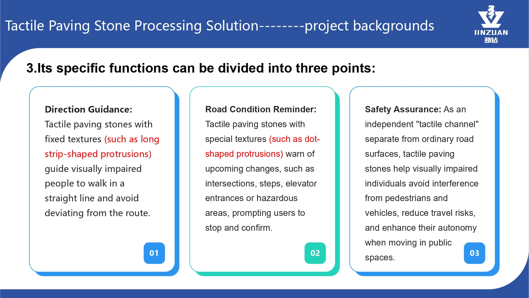 Traditional manufacturing methods struggle with consistency, output, and the precise detailing required for effective tactile guidance. Quanzhou Jingzuan Technology Co.,LTD provides a fully integrated, machine-based manufacturing solution that empowers concrete product manufacturers to produce compliant, high-quality tactile paving stones with superior efficiency and profitability.